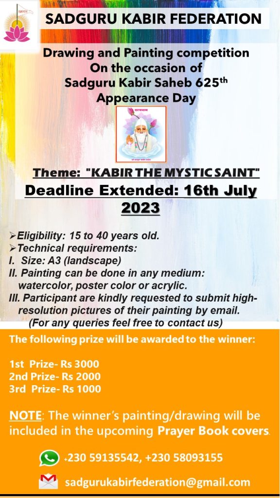 In the spirit of creativity, spirituality, and devotion to Sadguru Kabir Saheb, the Sadguru Kabir Federation Youth Wing is excited to announce the Sadguru Kabir Drawing and Painting Competition!